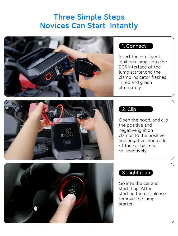Be prepared for any roadside emergency with our Jump Starter & Tyre Inflator—a compact, powerful, and reliable 2-in-1 device.